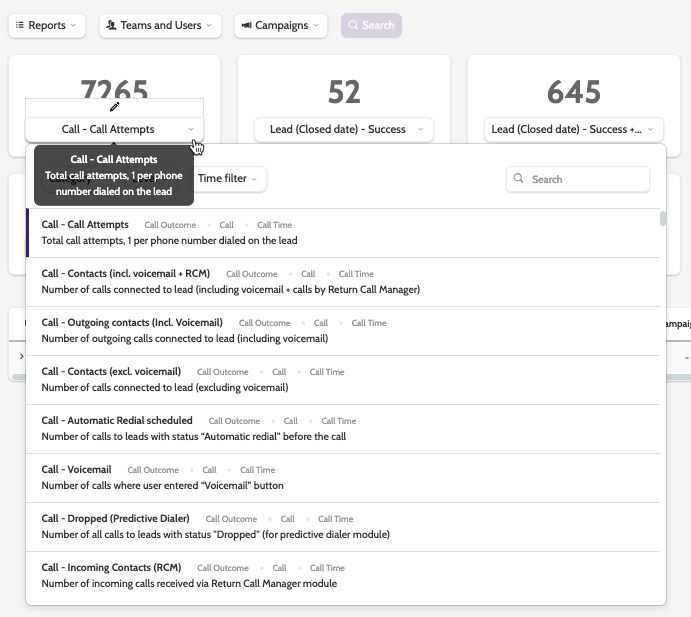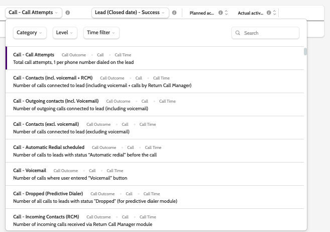 To the right of the organisation table are two KPI columns. The default views are Call - Call Attempts and Lead (Closed Date) - Success.