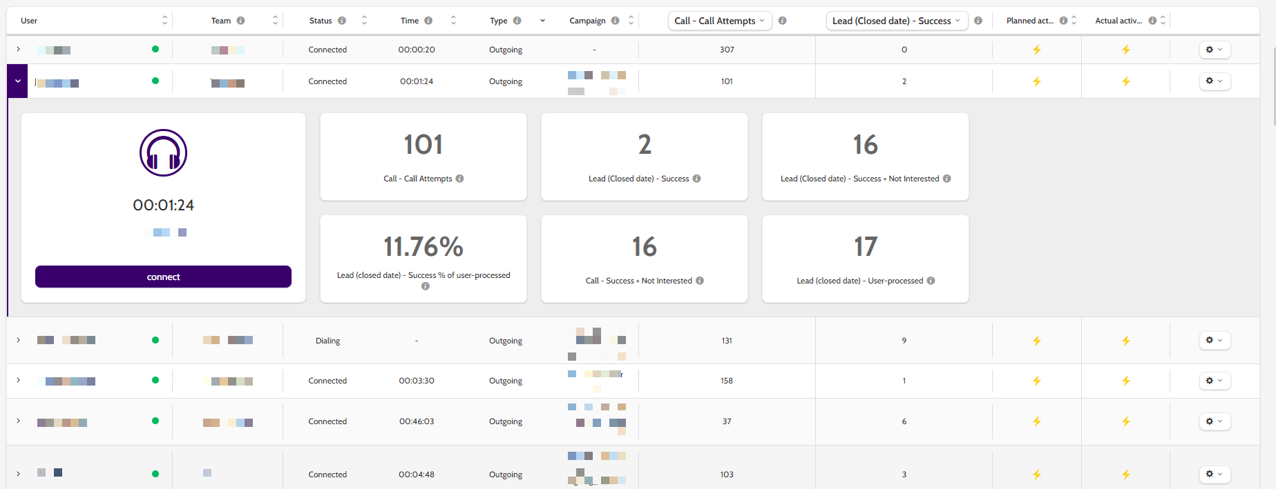 Click a user to expand their KPI data for their current dialing session, and if they are currently connected to a lead, click connect to monitor the conversation live.